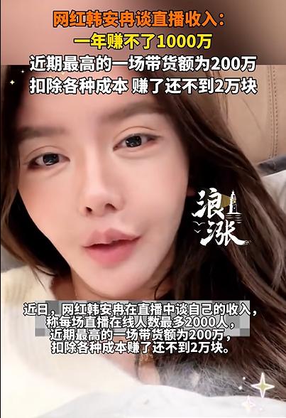 对着直播间的观众,韩安冉坦言自己一年赚不了1000万,近期带货销售额最高的一场直播卖了200万,但扣除各种成本,到手还不到2万块,说完自己的例子,韩安冉语重心长地感叹: