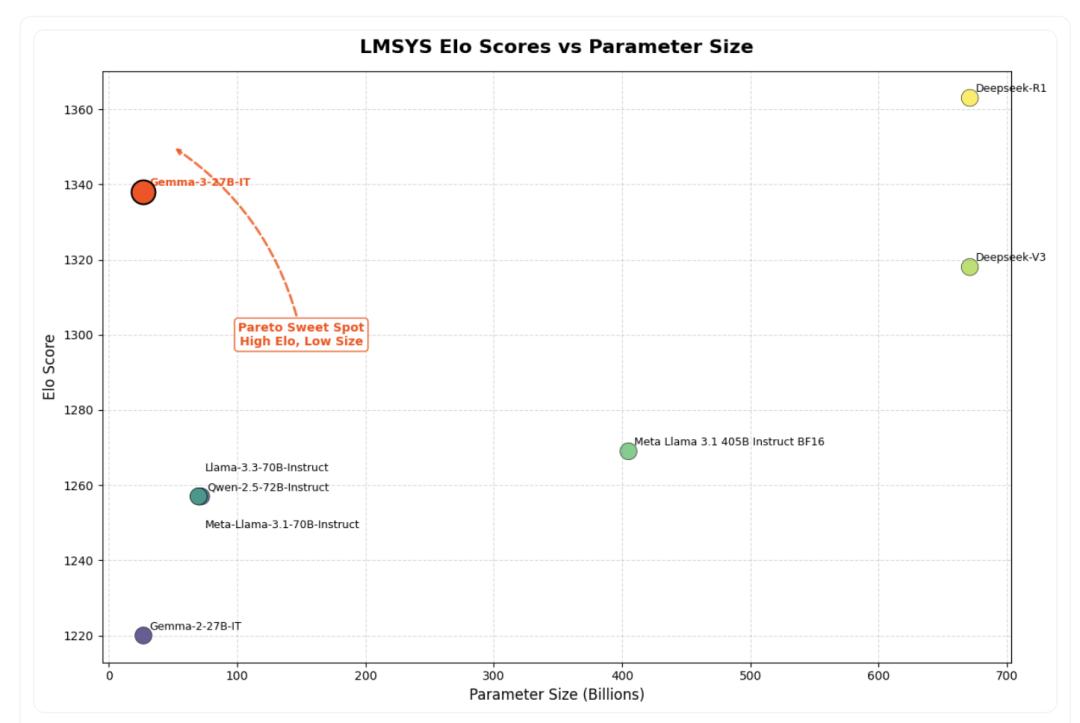 该图表根据 Chatbot Arena Elo 分数对 AI 模型进行排名;分数越高(顶部数字)表示用户偏好越高。圆点表示预估的 NVIDIA H100 GPU 需求。Gemma 3 27B 排名靠前,尽管其他模型需要多达 32 个 GPU,但它仅需单个 GPU 即可运行。
