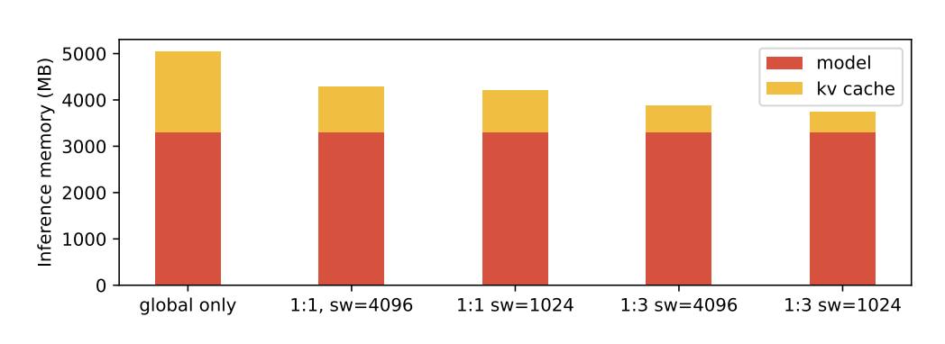 Gemma 3 通过增加“局部注意力层(local attention layers)”相较于全局注意力层(global attention layers)的比例,并缩短局部注意力的跨度(仅 1024 个 tokens),减少了长上下文时 KV 缓存爆炸问题。