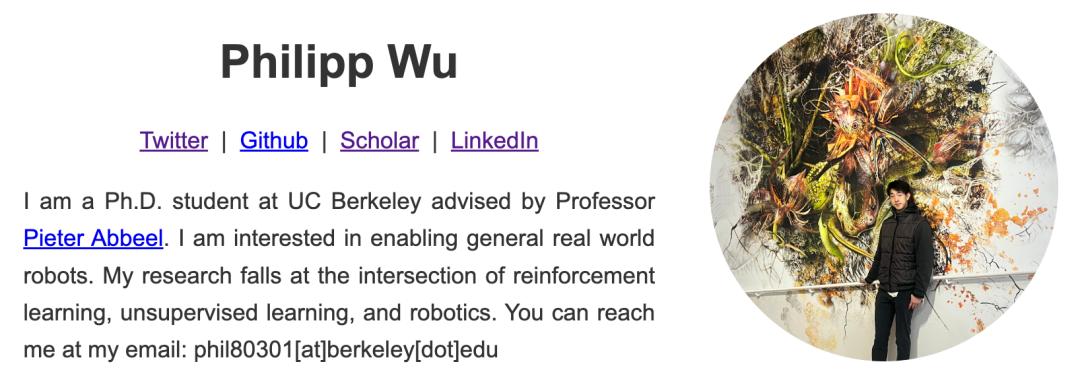 Philipp Wu 现为 Pieter Abbeel 的博士生(2021 年 8 月到 2026 年 5 月)。他的研究兴趣在于现实世界的通用机器人,研究涉及到了强化学习、无监督学习和机器人技术的交叉融合。