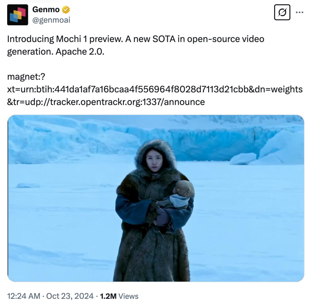 2024 年 10 月,Genmo 推出了 Mochi 1 开源视频生成模型的研究预览版本,可以实现高保真运动和强大实时性,尤其在遵循用户详细指令方面做得很好。