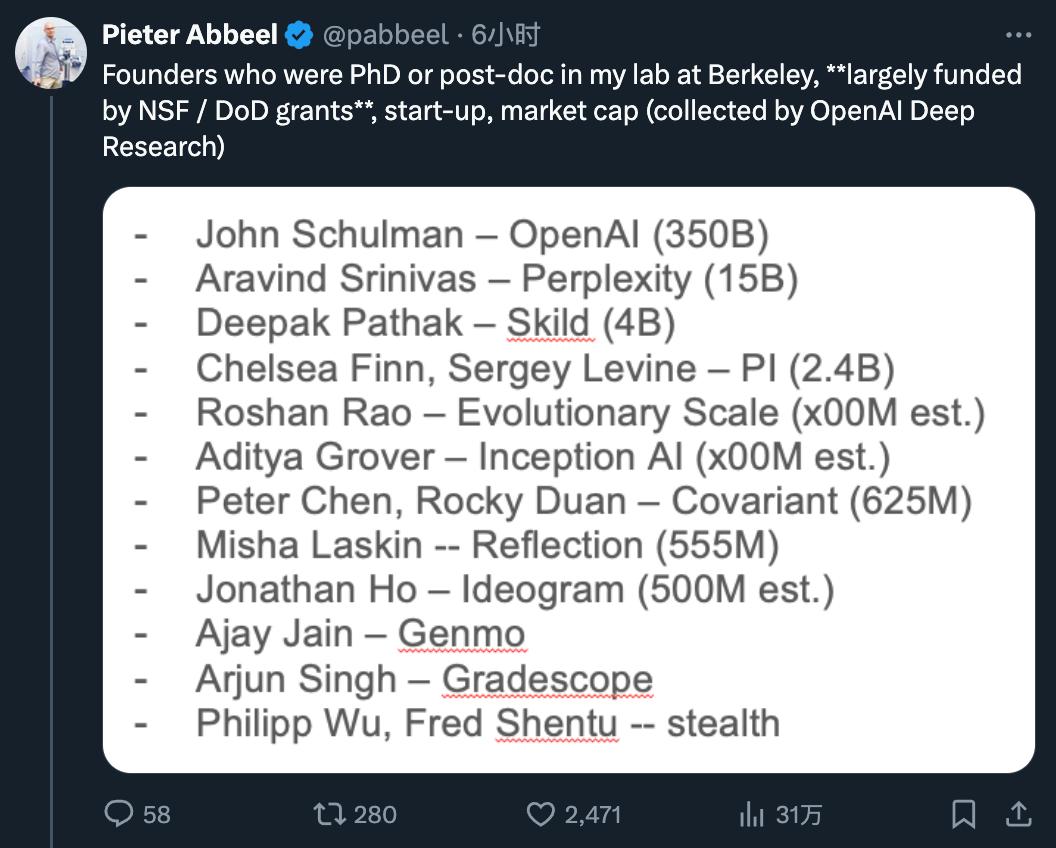下面我们盘点一下,Abbeel 口中的这些优秀学生们(人名后的信息为企业名+当前估值)。