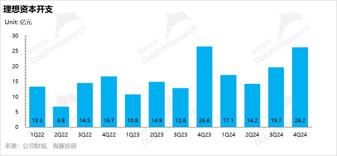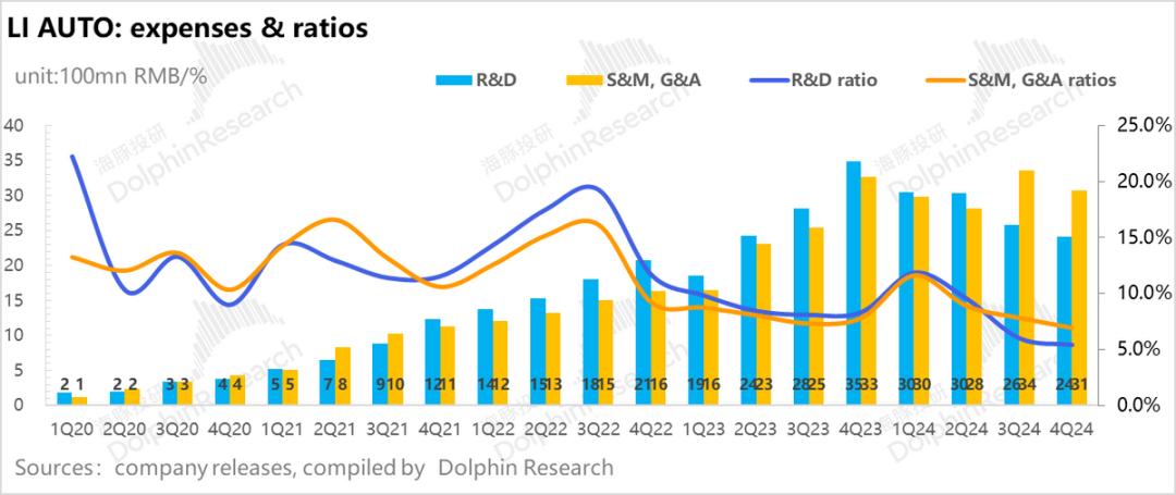 本季度理想研发费用24.1亿,环比上季度下滑1.8亿,低于市场预期的28亿