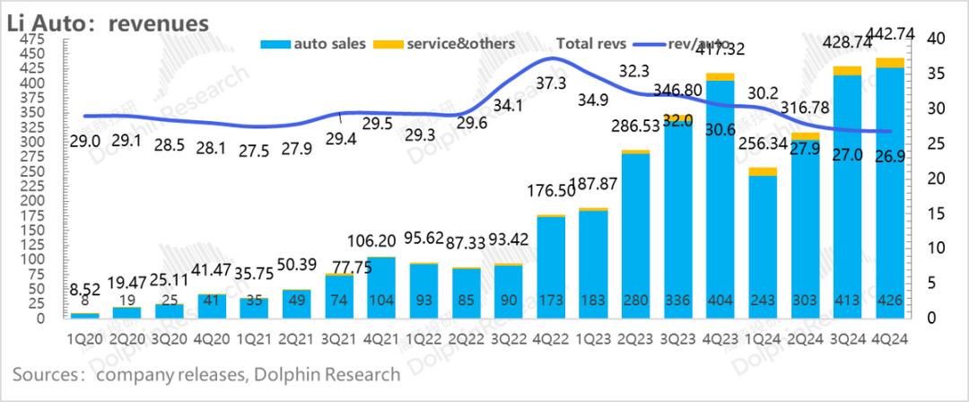在销量已经公布的情况下,四季度理想总收入是443亿, 环比上行3.3%,基本和市场预期一致,但低于部分大行的预期440亿元。