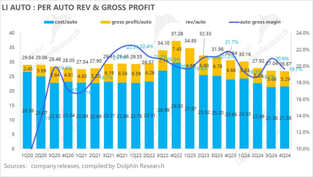 从4Q24业绩实际表现来看,在最关键的汽车毛利率上,理想此次miss掉了市场预期,本季度汽车业务毛利率仅19.7%,环比下滑了1.2个百分点,而市场一致预期还在20.6%,大行预期甚至都达到了21.3%。