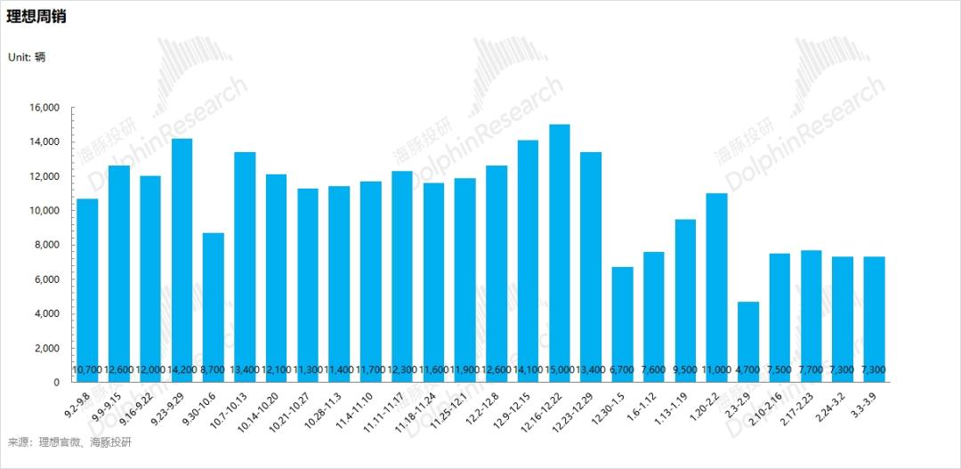 而目前理想最新一周的周销是7300辆(3/3-3/9),意味着在接下来的3周时间平均周销需要跑到7600-9200辆左右,在3月初已经开始对老款降价的情况下,虽然3月没新车,海豚君预计完成指引下限难度不大,但仍然要观测周销来看降价的作用有多大(能否完成指引上限)。