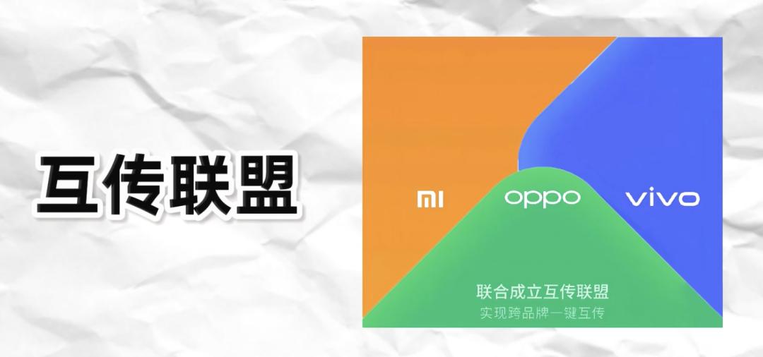 互传联盟由小米、OPPO 和 vivo 成立于 2019 年,目的是在这三个品牌的设备之间,实现类似于华为分享和苹果 AirDrop 那样的文件传输体验。