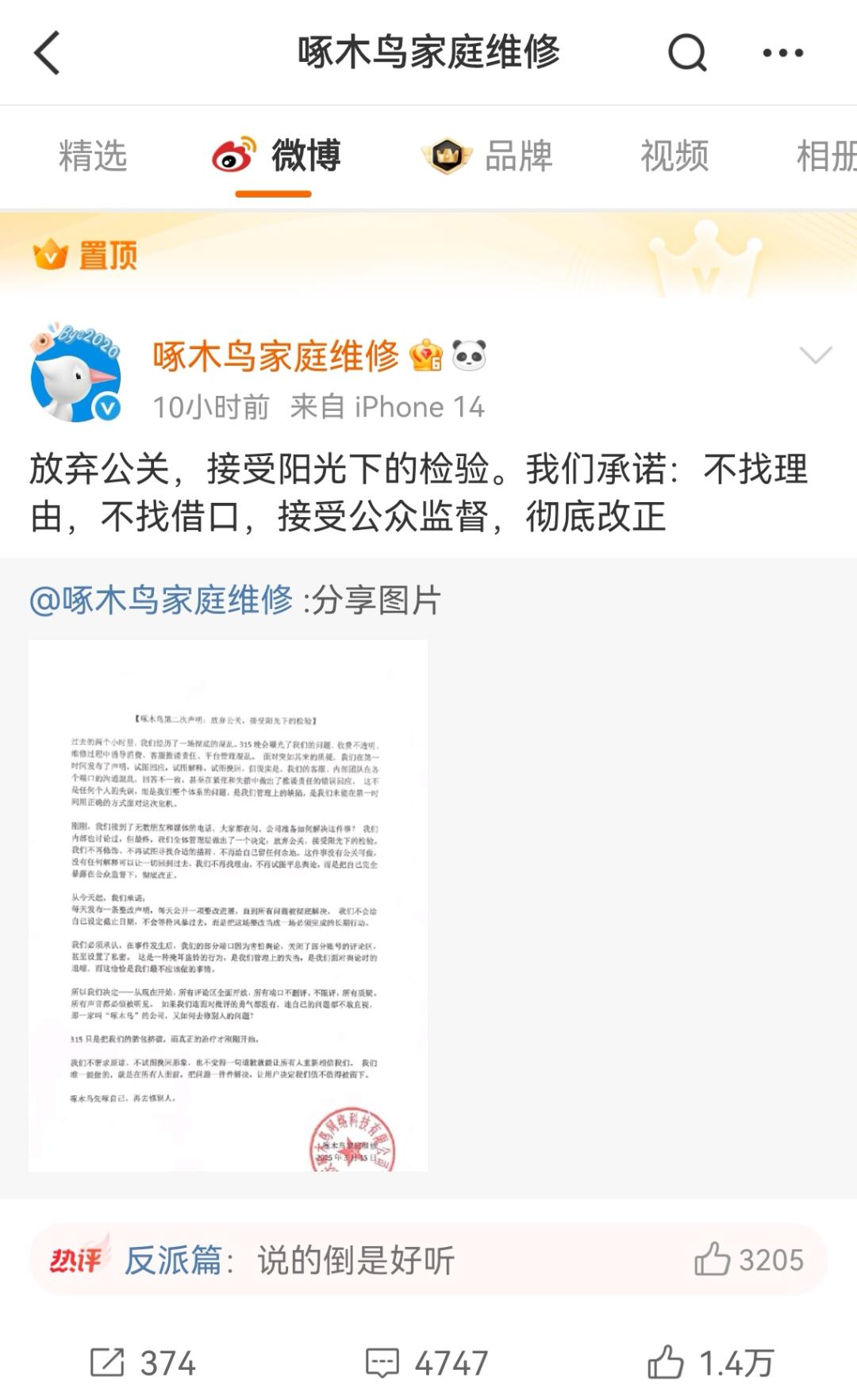 不久后,啄木鸟家庭维修在微博进行第二次声明,表示放弃公关,接受阳光下的检验。