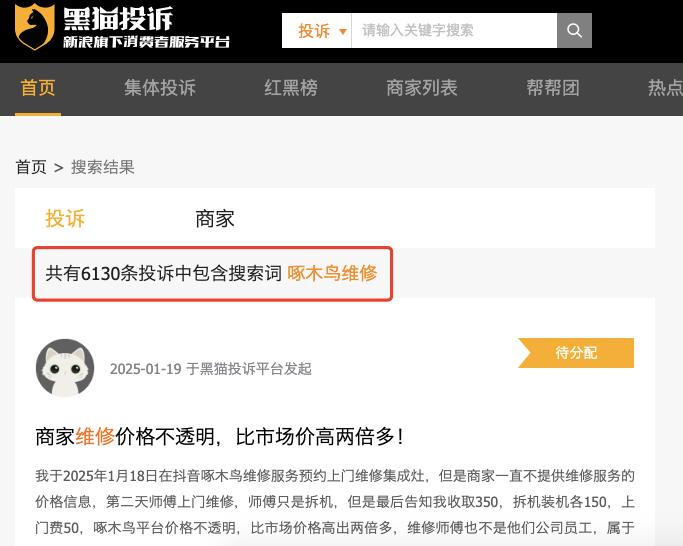 过去几年,在社交平台上,不少用户发“避雷贴”吐槽啄木鸟维修乱象。截至发稿,黑猫投诉平台上,啄木鸟维修已经有超过6100条投诉记录,主要原因集中在“维修价格不透明”“强买强卖”“维修恶意收高价”等等。