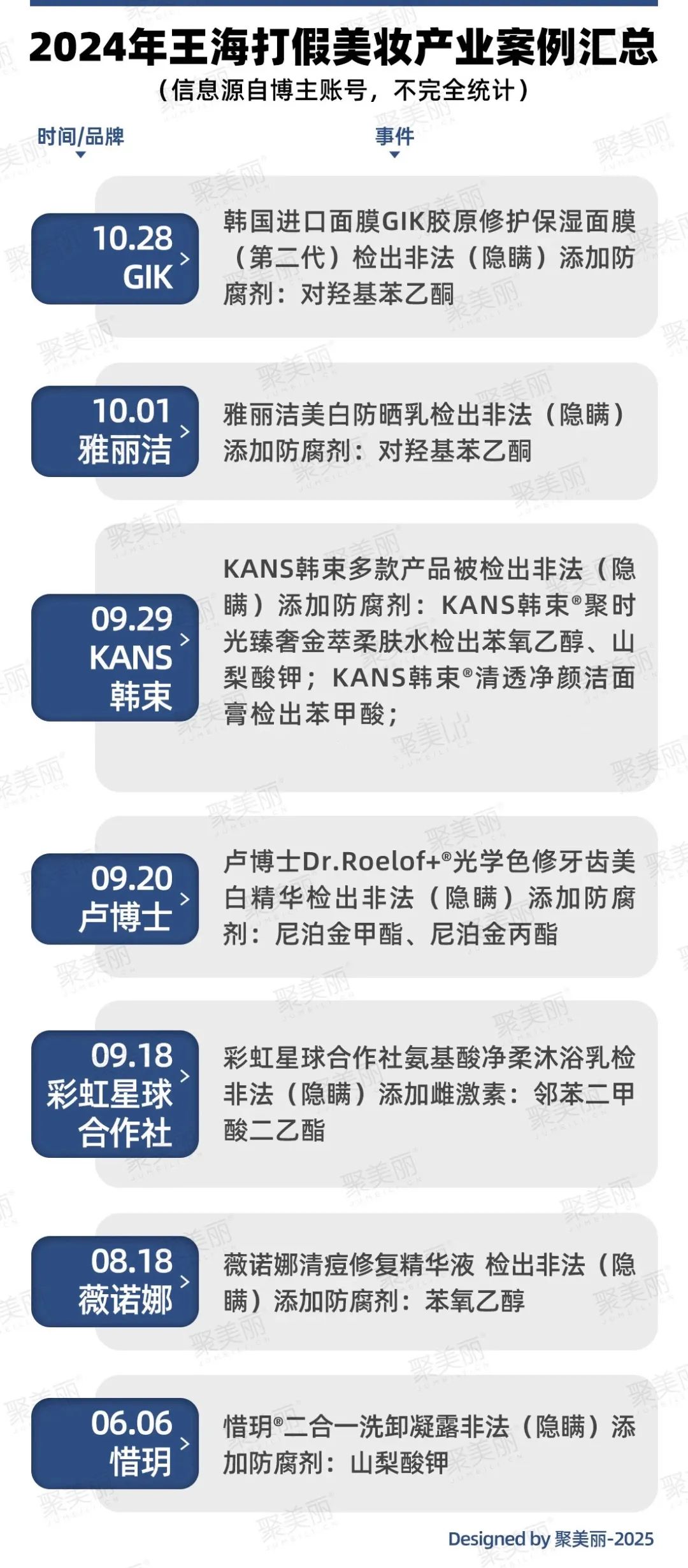 据聚美丽不完全统计,2024年王海打假美妆产业案例达7起,其中还包括薇诺娜、韩束等头部品牌,主要是针对美妆产品捡出非法(隐瞒)添加防腐剂。