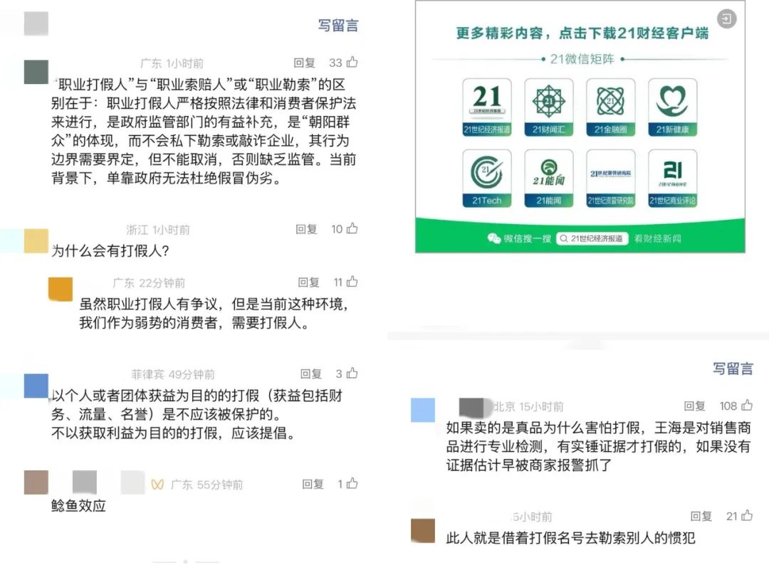 在《21世纪经济报》、《中国经营报》、《电商Pro》报道的评论区中,有部分网友表示,“此人就是借着打假名号去勒索别人的惯犯”、“以个人或者团体获益为目的的打假是不应该被保护的……”、“屠龙者终变成恶龙,实在可惜了”等。