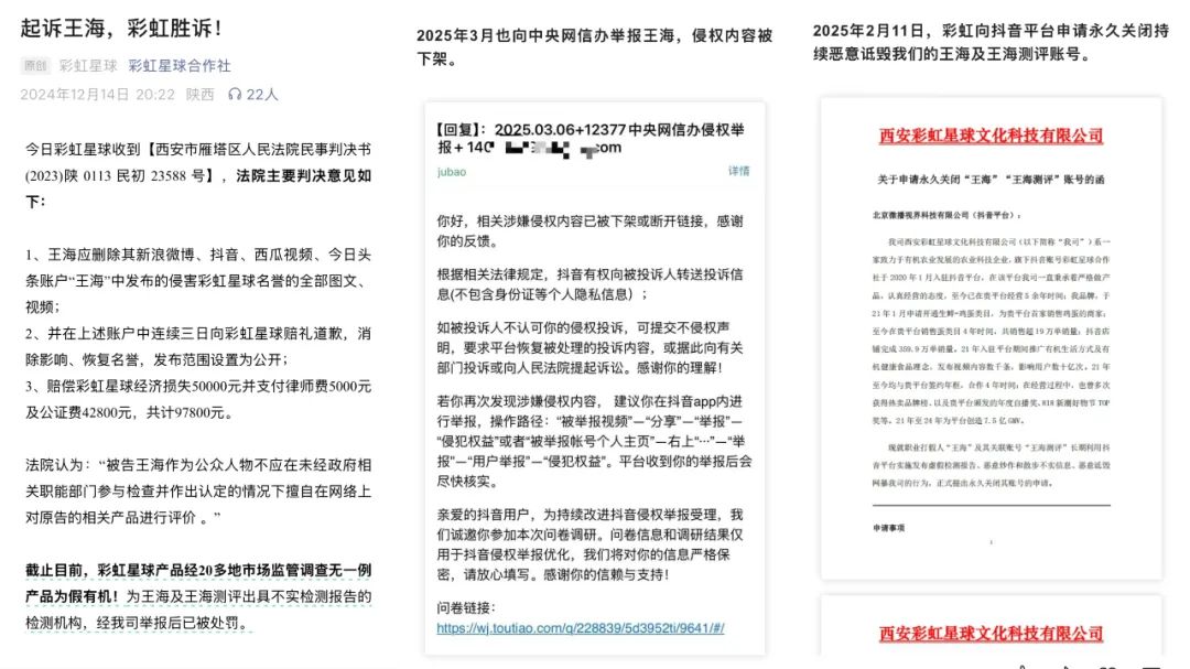 且据彩虹星球推文称,王海及王海测评使用不实检测报告,擅自发布大量视频诋毁彩虹星球产品为假有机,对其造成了不可估量的商誉影响,包括产品销量大幅下滑、人才流失、供应商终止合作、业绩亏损等。