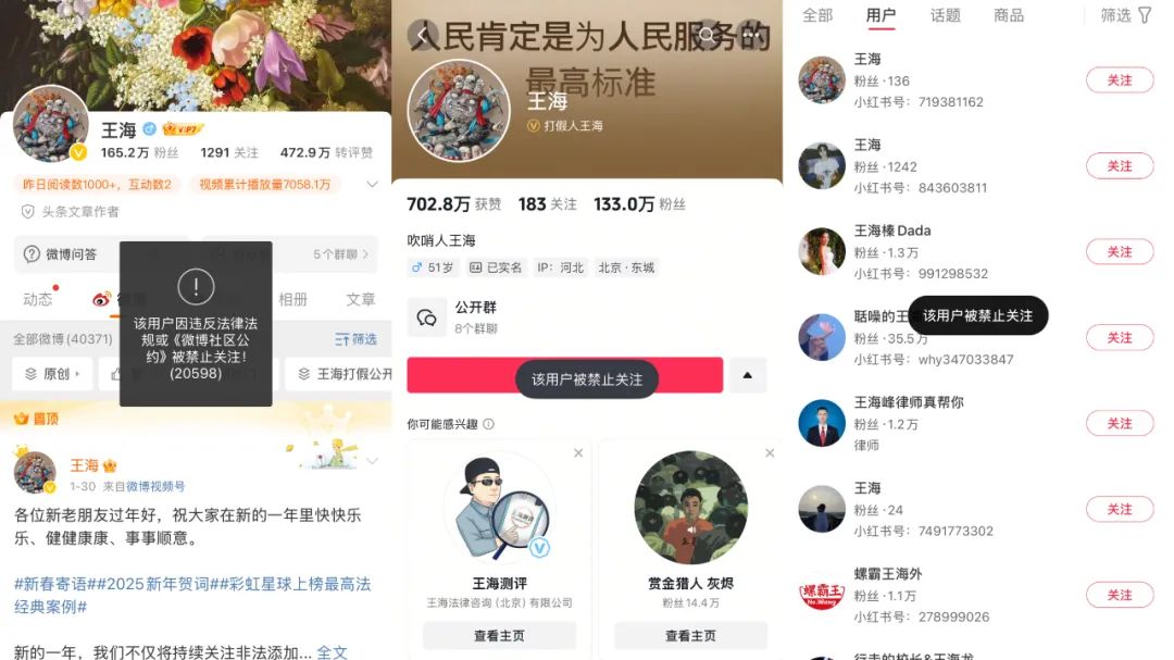 就在3.15前夕(3月14日),王海在抖音、微博、小红书等平台的个人账号显示被禁止关注与评论,其中微博还显示原因为该用户违反法律法规或《微博社区公约》。