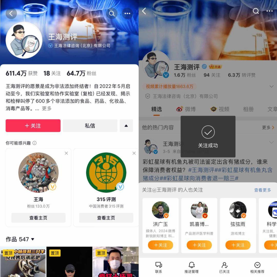 不过,值得注意的是,王海个人账号虽说被禁止关注与评论,但与其相关的打假账号王海测评仍可关注与评论。