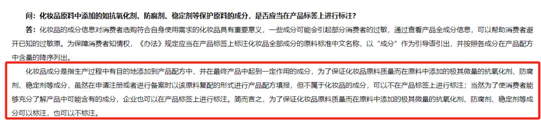 而从法规层面来看,该事件也颇有争议。2022年国家药监局发布《化妆品监督管理常见问题解答(五)》中规定,化妆品原料中极其微量的防腐剂等成分可不标注在成分表中。