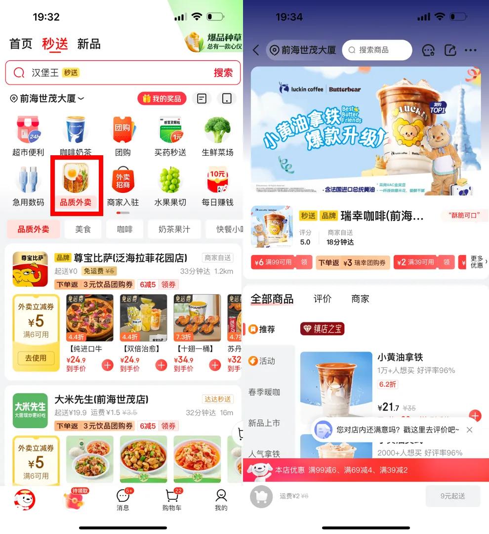 京东则以“供应链+即时配送”重构竞争逻辑。依托亚洲一号智能仓和达达快送,京东将家电、数码等高客单价商品的配送时效压缩至30分钟。京东外卖也并非单纯的外卖业务,而是其即时零售战略的关键一环。通过整合“秒送”频道、达达骑手网络与主站流量,试图以高频的外卖订单,京东希望带动生鲜、3C数码、医药等低频即时零售品类的增长,形成“电商+本地生活”的协同效应。例如,用户在京东APP下单外卖的同时,可同步购买手机、日用品等商品,享受一站式配送服务。