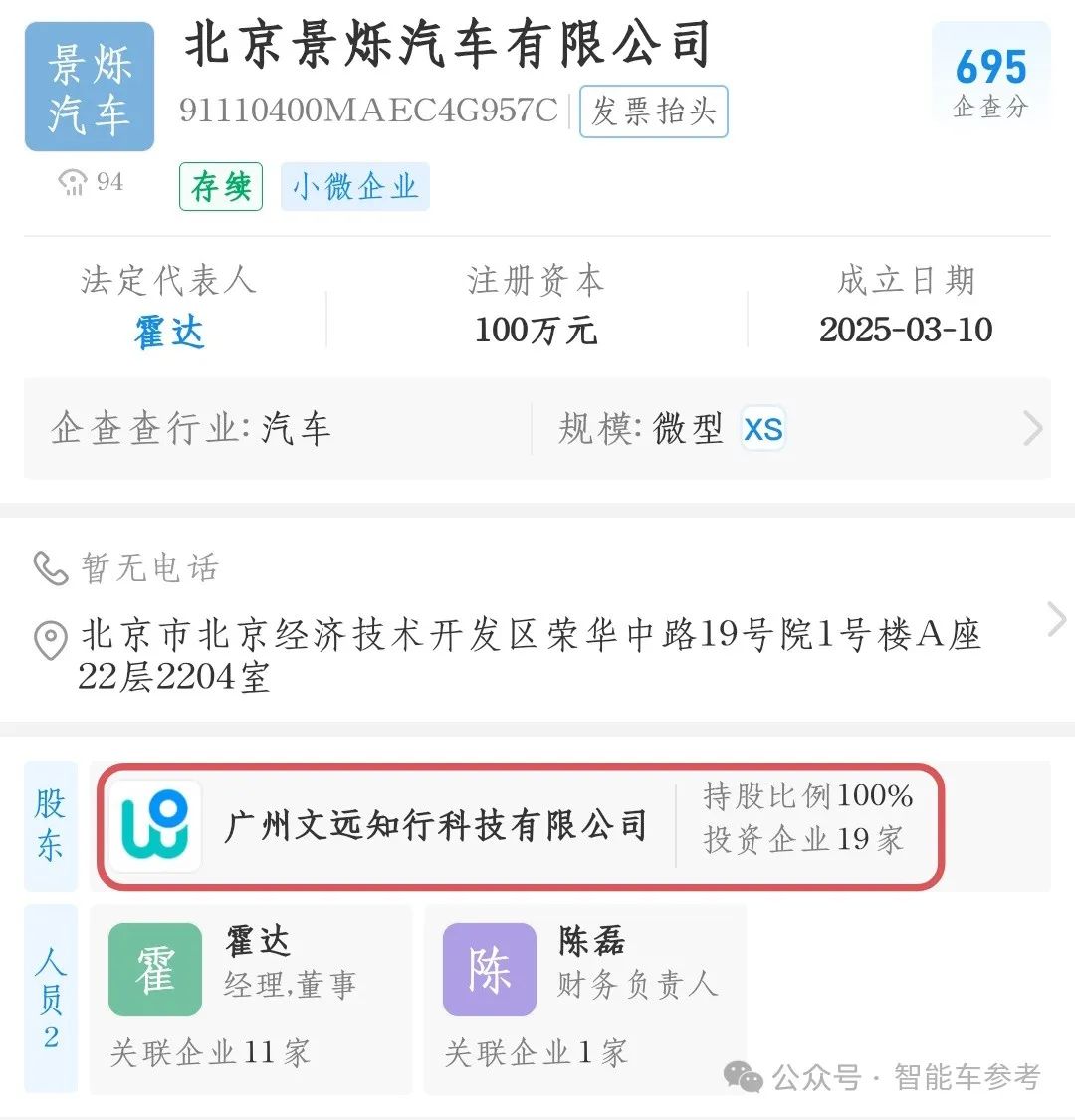 公开工商显示,文远知行最近全资控股,在北京成立了一家新公司——北京景烁汽车有限公司。