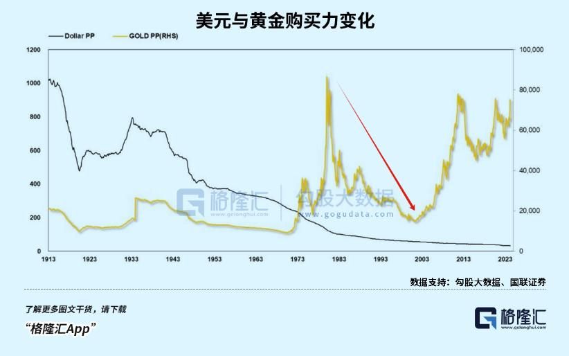 换句话说,黄金本身的实际购买力,在20年内缩水了5倍。