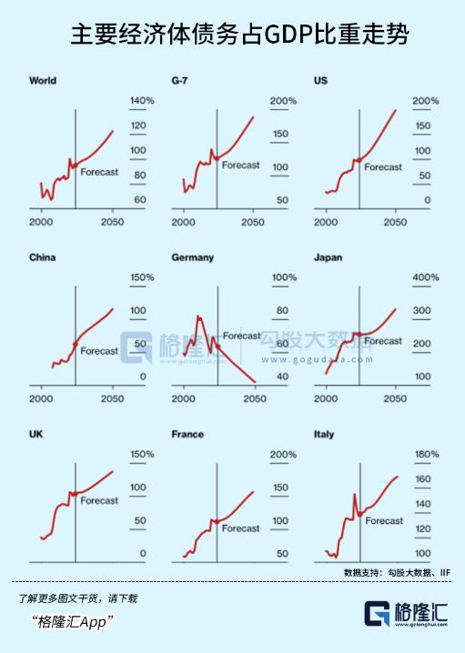 看下图,根据IIF的预测,全球主要经济体中,除了德国,政府债务的增速都将越来越快,最健康的在2050年之前占GDP比重也会超过100%。