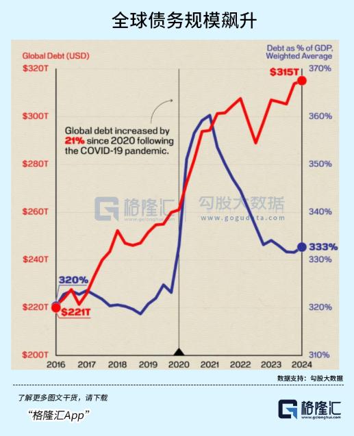 而从2019年至2024年12月,五年之内,全球债务规模飙升了20%以上,总规模达到318万亿美元,比前一年增加7万亿美元,与全球GDP之比飙升至328%,比上一点增长1.5%。