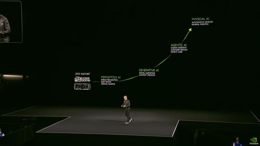 最早是判别式 AI(语音识别、图像识别),接着是生成式 AI,然后就是当下我们身处的 Agentic AI,未来会是影响物理世界的 Physical AI。这一技术演进路径清晰地展示了 AI 从简单任务处理到复杂推理,再到与物理世界深度交互的发展趋势。英伟达在每个阶段都扮演了关键角色,通过硬件和软件的不断创新,推动 AI 技术突破边界。