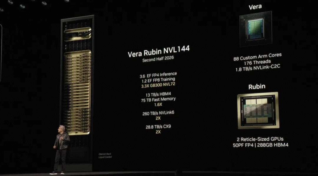 在 AI 芯片领域,英伟达从未掩饰其 “军备竞赛” 的姿态。此次 GTC,黄仁勋祭出了 Blackwell Ultra 与 Vera Rubin 两代架构的 “组合拳”,直指行业痛点:推理算力需求正以指数级爆炸。Blackwell Ultra 的核心突破在于 “液冷 + 硅光子” 的协同进化。基于 5nm 工艺,单颗芯片集成 288GB HBM3e 显存,FP4 算力达 15 PetaFLOPS,而 72 颗 GPU 组成的 NVLink 72 机柜系统,推理速度较上一代 Hopper 架构飙升 40 倍。更关键的是,英伟达将液冷技术推向机架级,通过浸没式相变冷却,使单机柜算力密度突破 1 ExaFLOPS,同时降低 30% 能耗。这种 “暴力美学” 背后,是应对 Agentic AI 时代 token 吞吐量需求的终极方案。