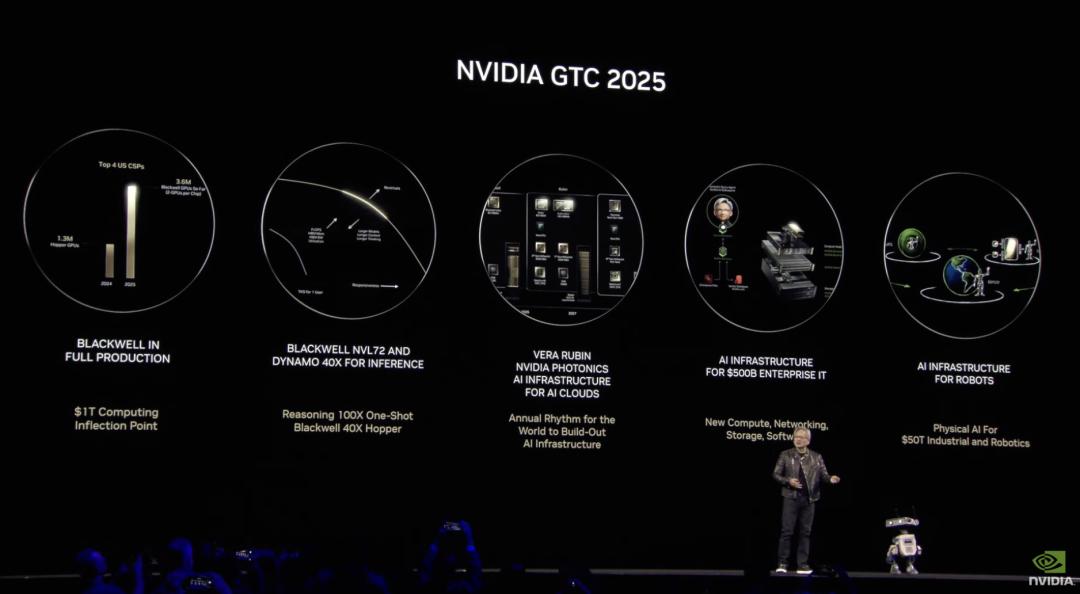 在 2025 年的 GTC 大会上,英伟达 CEO 黄仁勋以标志性的黑色皮衣登上舞台,为全球科技爱好者带来了一场信息量巨大的主题演讲。此次大会,英伟达不仅发布了多款重磅产品和技术,还全面展示了其在 AI 领域的战略布局和对未来技术发展的深刻洞察。从 AI 芯片的迭代升级到具身智能的突破,英伟达正以全方位的技术革新引领 AI 新时代。