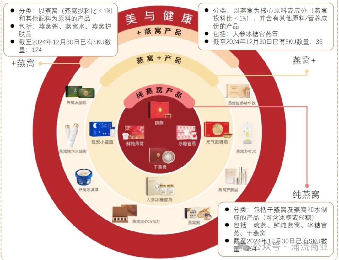 公司另外两大类别:纯燕窝有264个sku;燕窝+产品(投料比在1%-5%之间)有36个sku,与2023年底相比均小有增加。