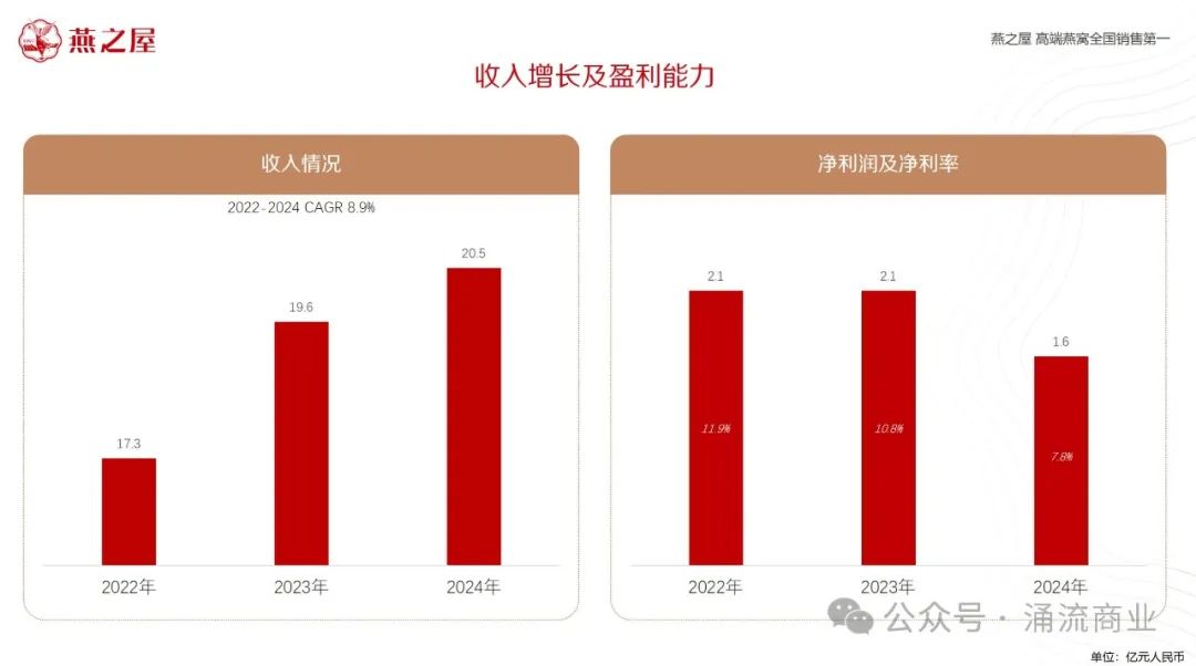 2024年,燕之屋实现营收20.5亿元,同比增长4.37%;收入增长在放缓,2022-2024年收入的年均复合增长率为8.9%。