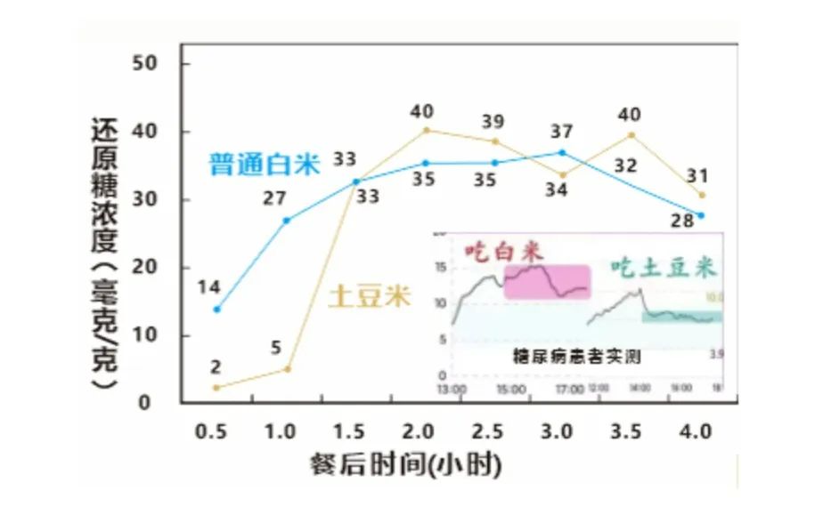 在深圳大学科学发展技术研究院网站的土豆米介绍页上,也附有土豆米和普通白米餐后还原糖浓度变化的相关对比图资料。