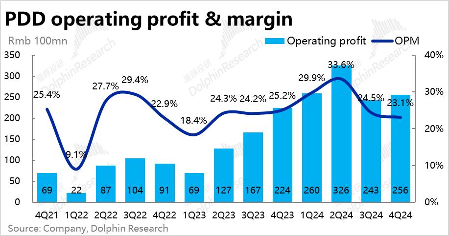 趋势上,经营利润率较上季继续下滑了1.4pct 到23.1%,利润额的同比增速也仅剩14%。拼多多的利润增速正式进入了10%开头的水平。
