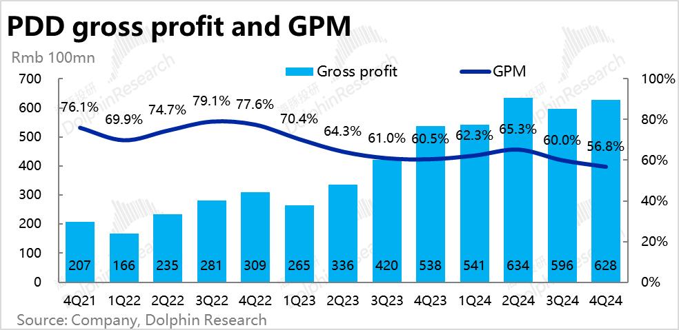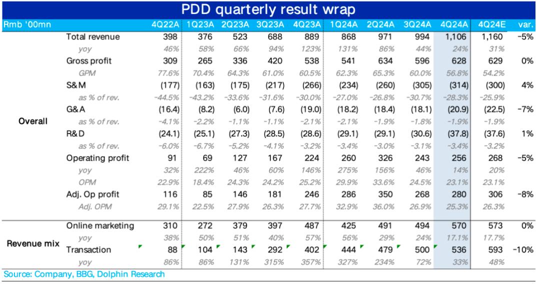 3、毛利润将将达标:本季拼多多毛利率为56.8%,同环比来看都下滑了3pct以上。不过卖方一致预期更加悲观,仅为54%。实际表现稍好于悲观预期,可能正因为Temu向半托管结构倾斜,实际在毛利率是相对利好的。但因为主站佣金的减免(收入可能负增长),毛利率整体仍是下滑的。