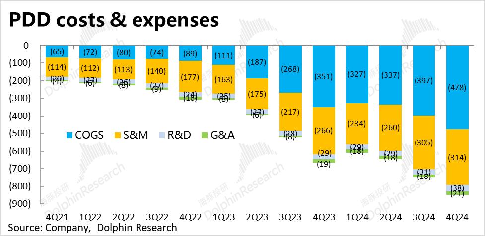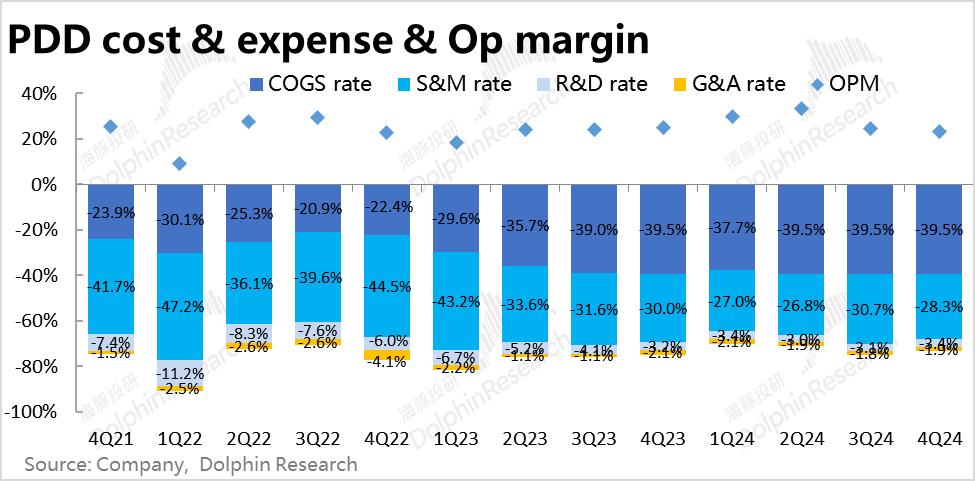 4、“国补”自己掏钱:费用层面,值得关注的有两点。一是营销费用支出314亿,同比增长18%。且相比隐含的预期,稍稍多出10几亿。且据了解,本季Temu的营销费用支出可能是同比收窄的,那么一反一正,本季主站的营销费用比去年同期可能增加了大几十亿。可能是反映了多多自己出钱在“国补”上的支出。