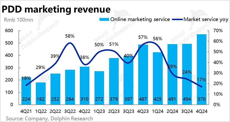 “略感欣慰”的是,最核心收入—主要反映主站情况的广告收入本季为570亿,同比增长了17%,和卖方一致预期基本一致,没有在核心业务上“暴雷”。但是海豚投研了解,一些头部卖方对本季的广告收入增速预期是在20%~24%之间(基于20%上下的主站GMV增速)。因此虽然实际增速符合一致预期,但对业绩期看多的偏乐观资金而言可能还是失望的。