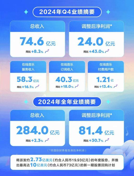 2024年第四季度,腾讯音乐总收入为74.6亿元,同比增长8.2%,调整后净利润24.0亿元,同比增长43.0%。主要得益于在线音乐服务收入同比强劲增长,部分被社交娱乐服务和其他服务收入下降所抵销。