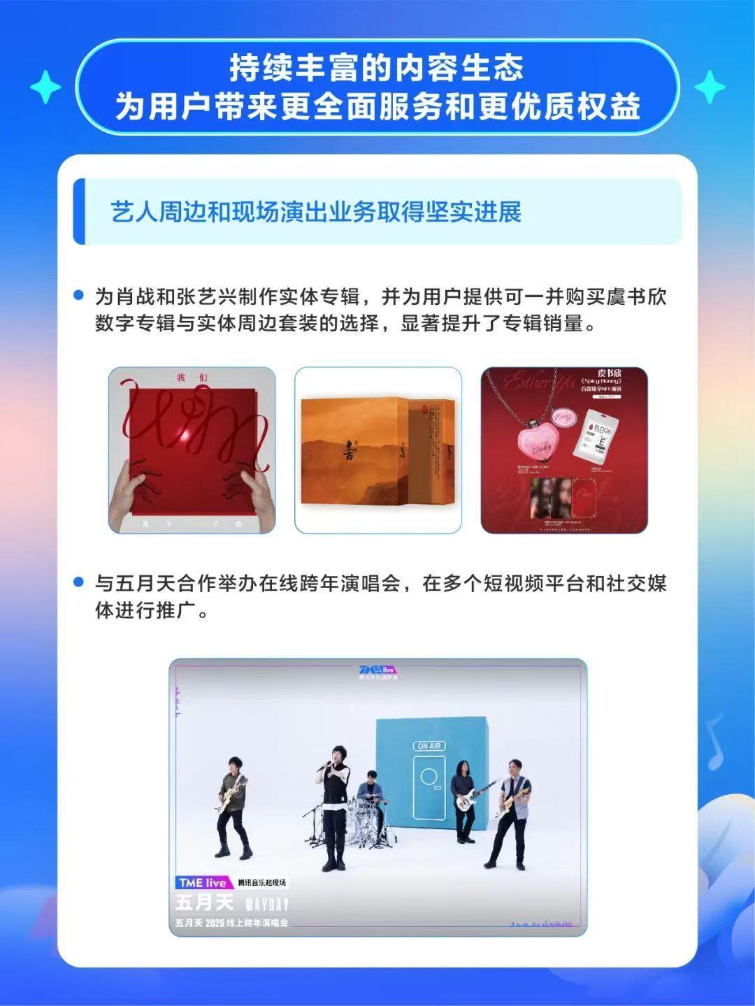 在艺人周边和现场演出业务上,为肖战和张艺兴制作实体专辑,为用户提供虞书欣数字专辑与实体周边捆绑购买选项,显著提升专辑销量;与五月天合作举办在线跨年演唱会,并借助多个短视频平台和社交媒体进行推广,吸引海量用户观看,打造了现象级音乐盛事,极大增强了用户对平台的粘性与归属感。