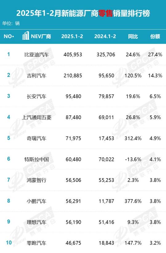 2025年1月-2月新能源厂商零售销量排行榜显示,入围前十的造车新势力是小鹏汽车、理想汽车和零跑汽车,蔚来汽车未进入前十,销量垫底“蔚小理”。蔚来2025年第一季度交付指引为4.1万辆到4.3万辆,同比增长30%。