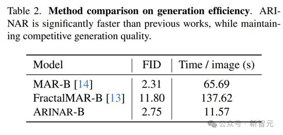 生成速度上,ARINAR-B生成一张图像的平均时间仅需11.57秒,而MAR-B需要65.69秒,FractalMAR-B则需要137.62秒。ARINAR在保持高质量生成的同时,显著提升了生成速度。