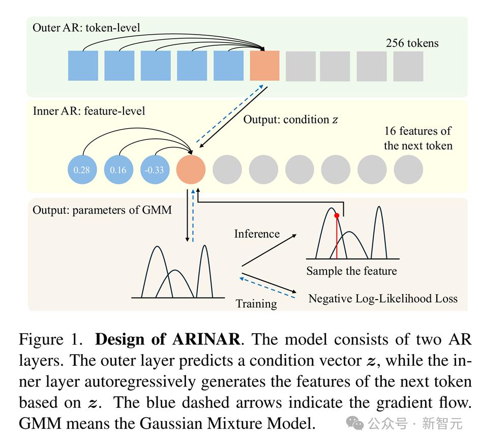 这种双层结构的好处是,内层自回归只需专注于单个特征的生成,而不需要一次性建模整个token的分布。因此,内层可以使用简单的高斯混合模型(GMM)来建模单个特征的分布,从而大大简化了预测token分布的难度。