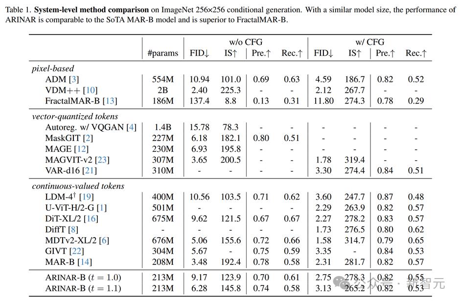 研究人员在ImageNet 256×256图像生成任务上对ARINAR进行了测试,使用了213M参数的模型(ARINAR-B)。实验结果显示: