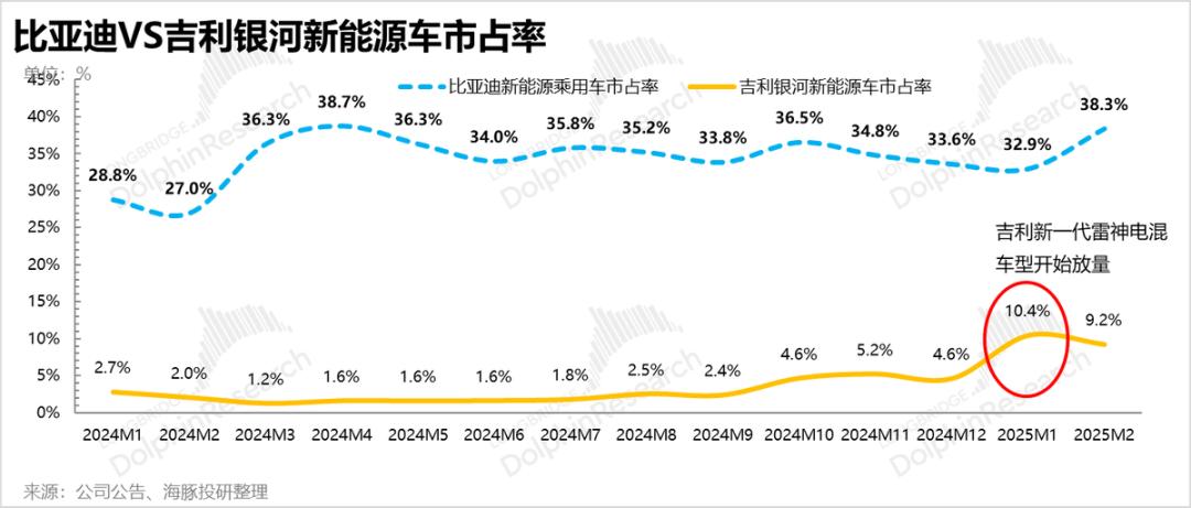 但从月度的数据来看,比亚迪在10月市占率达到高峰后,后续的市占率仍在下滑,海豚君认为主要是由于同行如吉利,在2024年下半年就开始发布此类技术,2024年末就开始了大规模量产(银河星舰7 EMI),成功打造出爆款车型,而比亚迪混 动技术的代差先发优势已经被同行基本追平,再加上比亚迪四季度基本对现有车型降价幅度小,所以导致比亚迪2024年12月和2025年1月销量都不及市场预期。