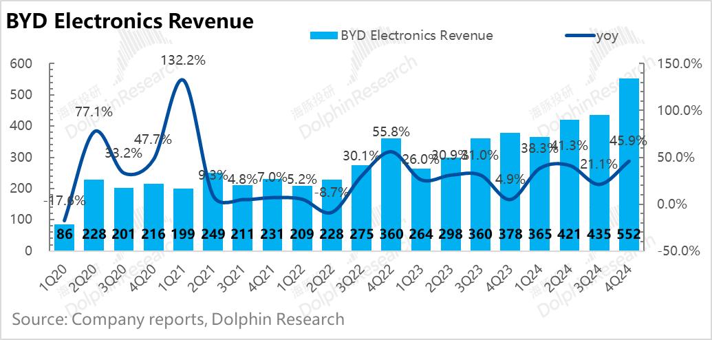 四季度,以比亚迪电子为运营主体的手机部件及组装业务实现营收551.8亿元,大超市场预期507亿,但毛利率端5.9%,环比下滑了2.6个百分点,不及市场预期8.7%,可能由于消费电子业务对毛利率的拖累。但在2025年比亚迪汽车销量仍然能保持确定性的高增趋势下,比亚迪电子预计仍然可以受益于汽车电子业务的高增长。
