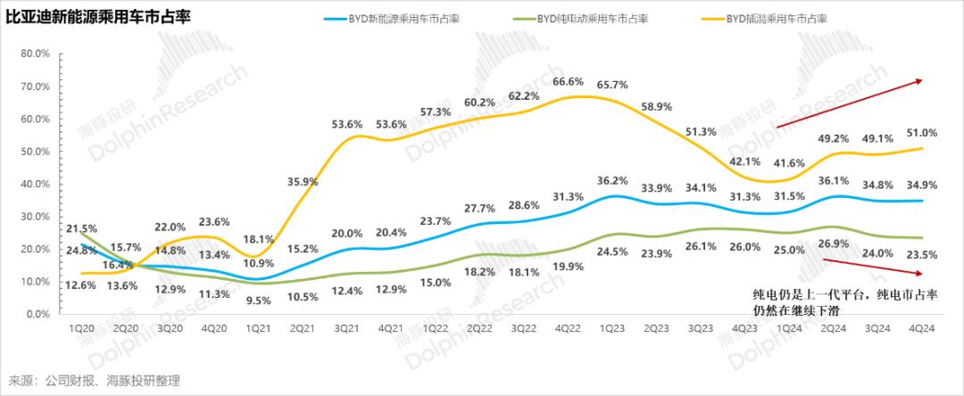但在纯电方面,由于比亚迪2024年四季度纯电车型仍采用的是上一代电动化平台,纯电车型竞争力在下降,所以纯电市占率四季度呈现下滑趋势。