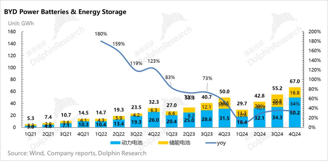 比亚迪动力电池和储能的装机量(含自供与外供)到四季度已达到了67GWh,环比增长21%,能源业务增长仍然还在继续放缓。