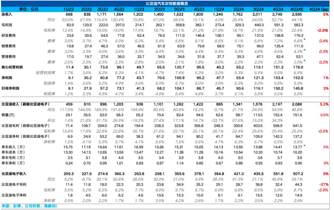 比亚迪(1211.HK)于北京时间 3月24日晚,港股盘后发布了 2024 年第四季度业绩。要点如下: