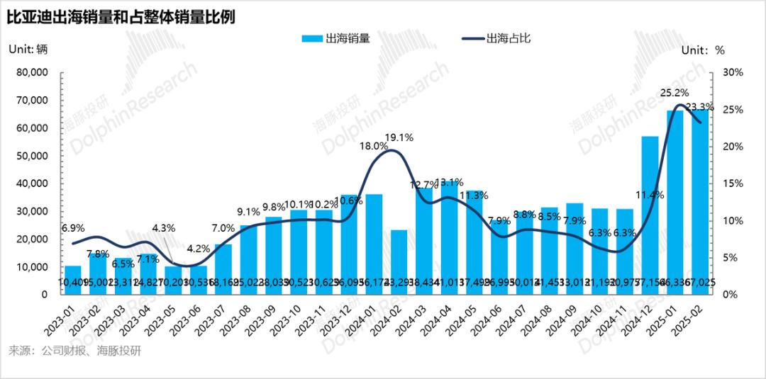 比亚迪在去年12月就开始对出口发起冲锋,并在今年1-2月国内销售淡季时,仍然通过出海贡献了比较大的增量,使比亚迪即使在销售淡季以及车型的换代期中仍然能稳住市占率,主要还是因为比亚迪的海外工厂已经开始投产(尤其是去年12月份起海外工厂的爬坡非常迅速,从原先依赖国内出口到目前已经转变为主要来自海外工厂自产为主)。