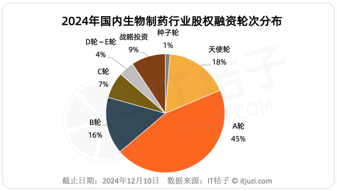 2024年国内生物技术与制药行业的融资轮次分布显示出“早期火热、后期谨慎”的特征。