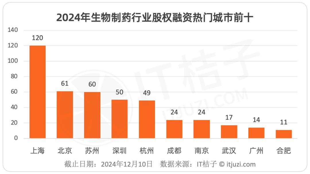 如图所示,上海依托张江药谷产业集群、金融中心资源及政策支持,以120次医药股权融资事件绝对领先,成为2024年医药融资最活跃的城市。上海获投代表企业有箕星药业、泽纳仕生物和昂阔医药。