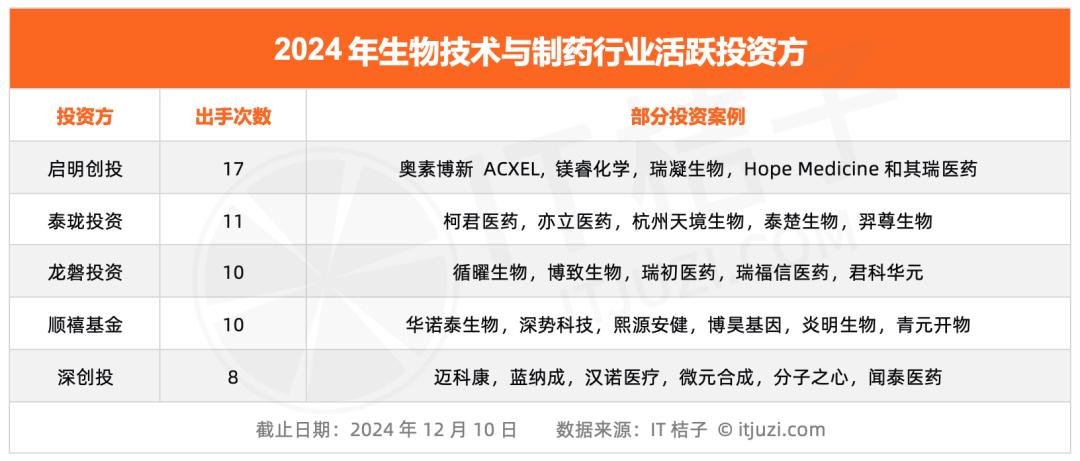 从出手次数来看,2024年启明创投以17次公开的医药投资事件领先,其投资组合覆盖了从早期技术研发到临床应用的多个环节,例如基因疗法开发商“奥素博新ACXEL”、化学合成生物公司“镁睿化学”、生物材料供应商“瑞凝生物”及免疫疗法研发上“和其瑞医药”,显示出其对前沿技术的全面押注和对创新药全链条的深度布局。