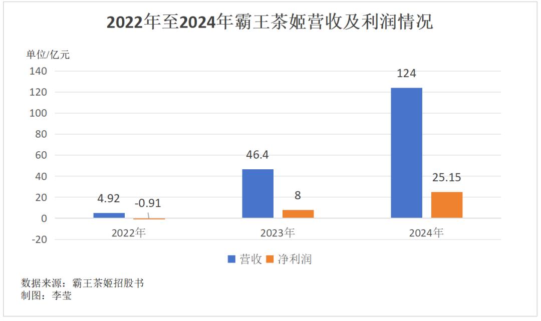 霸王茶姬的收入主要来自销售产品以及向加盟商提供服务。2024年,霸王茶姬全年营收124.05亿元,净利润为25.15亿元,其中来自加盟店的收入为116亿元,占营收的比例为93.8%。2024年底,霸王茶姬的加盟商数量达到3195位。